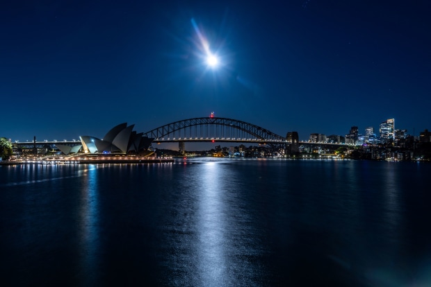 Sydney harbor bridge and the opera house in the early hours of the morning with a supermoon.
