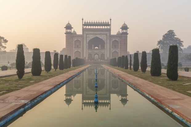 Looking back at the Taj Mahal East Gate reflected in the pond just after sunrise.