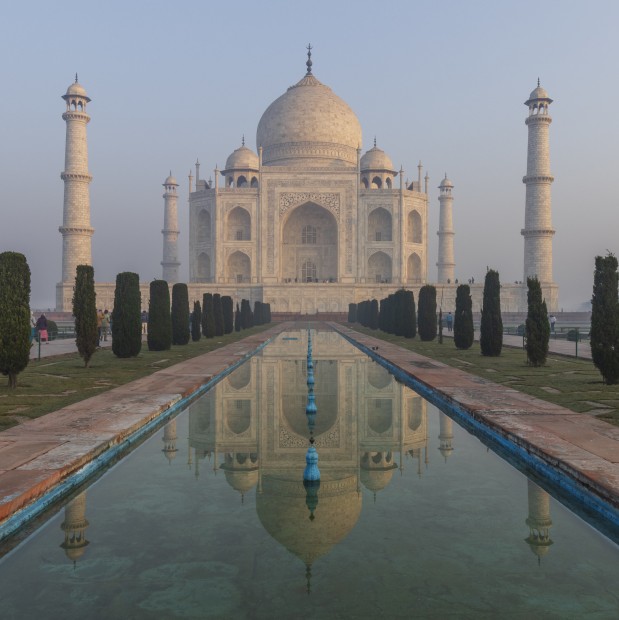 The stunning Taj Mahal reflected in the pond at sunrise.