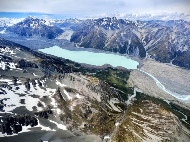 Flying in a chopper over Aoraki Mt Cook, and managed to capture the joining of Tasman Glacier with the melted ice, causing aqua glacial bloom among the rocks and snow.