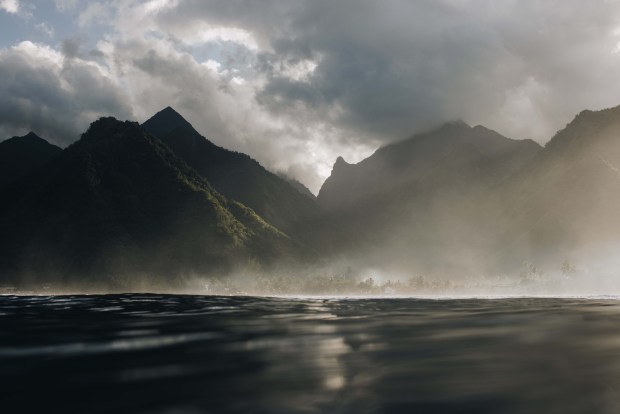 Photographed shortly after dawn below the mountains of Teahupoo, Tahiti.