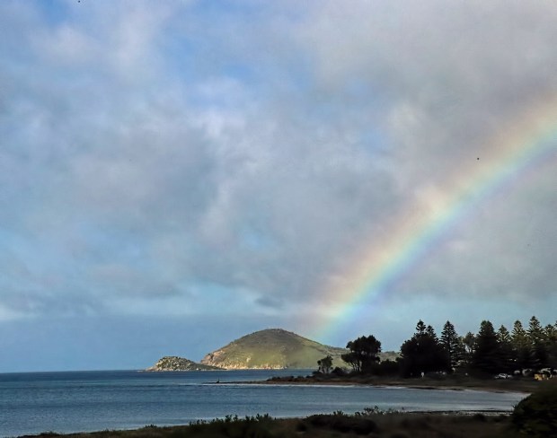 A storm had descended on Encounter Bay, Victor Harbor, South Australia when a beautiful rainbow appeared to light up The Bluff.