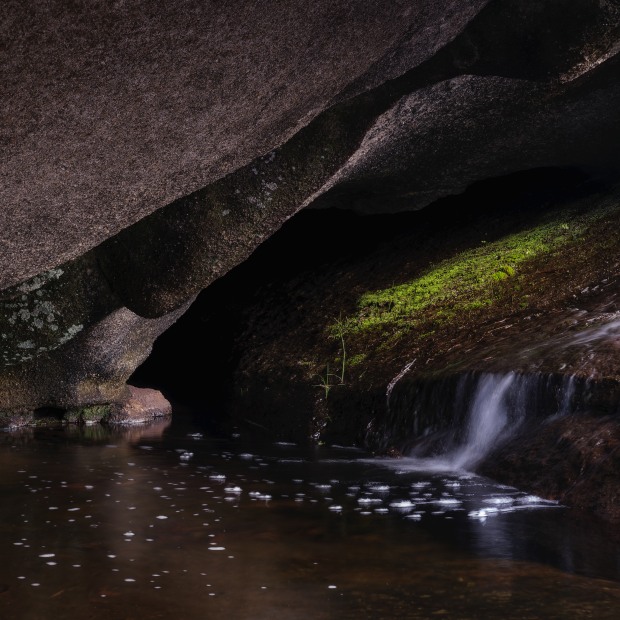 Taken in the Perth Hills. Even in the wet winter you have to go looking for running water in the Jarrah Forest, hidden in the dark recesses. Fleeting areas of illumination and clarity (the winter rain, the sunlight on the moss).