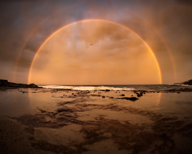 A Perfect Rainbow arching across the fiery sky at sunset. Sydney Australia