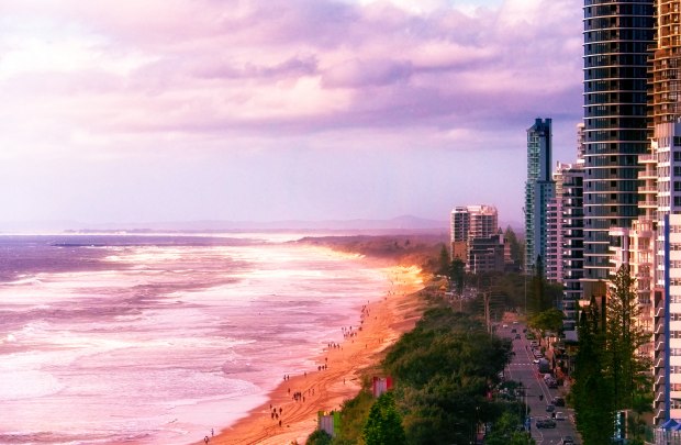 Taken early one morning as the sun was peaking over the horizon at the Gold Coast and you could see the mountains in the distance and the jetty poking out and a popular beach already humming with activity even though the streets were relatively quiet.
