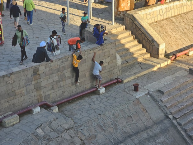 Children being helped over a wall, on the banks of the Nile