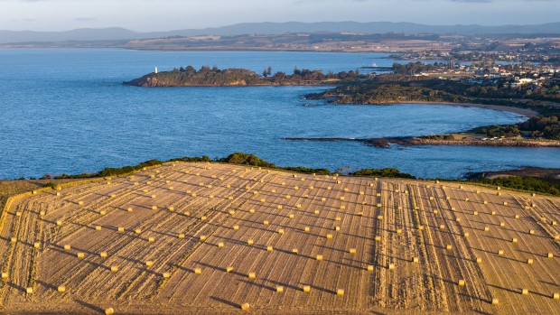 Hay bales on Don Heads, and their shadows in the afternoon light, looking across the water towards Mersey Bluff