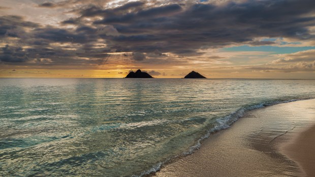 A light shower atop Moku Nui, the left twin island of the Na Mokulua pair in Lanikai, Hawaii appears to be sending a message from heaven to earth.