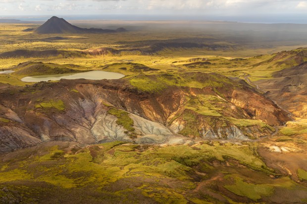 An arial shot of the volcanic landscape in Iceland. If you look hard enough there are two hikers on a trail, when spotted you can really appreciate the enormity of the environment.