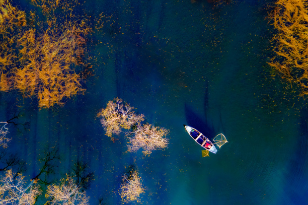 A small boat moves quietly through a flooded forest, its nets trailing over deep blue water. Pale and golden trees surround the lone fisherman, creating a calm, almost dreamlike scene. The moment feels simple and unhurried, capturing a gentle journey through nature.