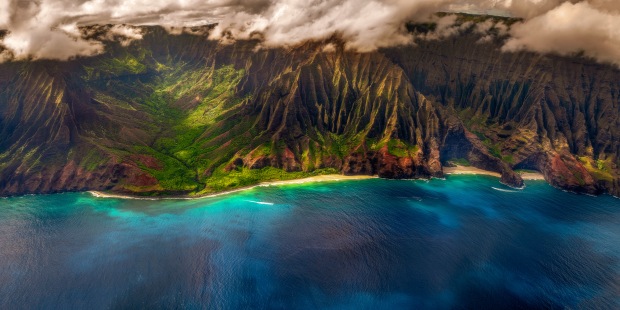A panoramic image showcasing the artwork crafted by a relationship of pure juxtaposition - Fire and Water and is a literal display of how our planet came to be as we know it today. The Na Pali coast on the Hawaiian island of Kauai was formed by the lava spat out by violent volcanos millions of years ago. Since then the surrounding water has chiseled this rock into sharp pointy peaks with intriguingly textured valleys and cliffs. The richness of the volcanic soil results in vivid colours with sheer brilliance, especially if the light touches the surface a certain way. The sea reflects the blue of the sky absorbing the colour so intensely with a luminance that seems impossible. The soft clouds resting at the tip of the volcanic peaks soften the scape while displaying the unique weather system of the region.