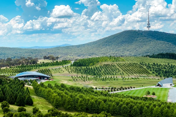 A view of the National Arboretum from Dairy Farmers Hill Lookout in Canberra