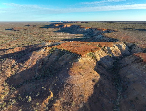 Late afternoon sunlight and shadows caress scree slopes and cliffs of the Eastern Kennedy Range Escarpment. The terrain falls 100m away from a sharp break in the plateau to the west down to a vast arid plane to the east and the escarpment dances away to the horizon around buttes and in and out of gorges. Views of the escarpment from our camp high on "The Neck" in the foreground are breathtaking while highly fossiliferous strata, captured in this aerial shot are just below us, frustratingly close but inaccessible.