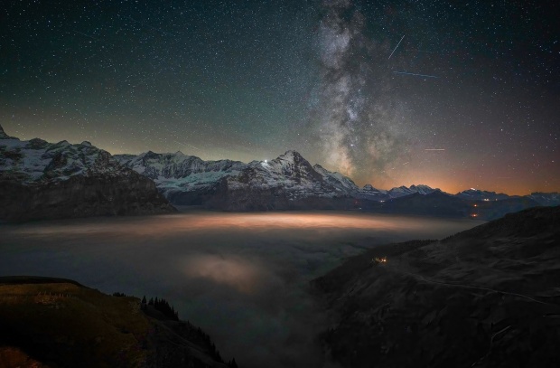 Captured in the Jungfrau Region of the Bernese Alps, Switzerland, this image shows the Milky Way rising above snow-covered peaks, with a sea of clouds flowing quietly below. Under exceptionally clear night skies, the galactic core illuminates the landscape , revealing a rare moment where mountains, clouds, and starlight align in stillness.