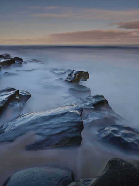 Like a serpents head, one rock stands out, facing the coming tide.
