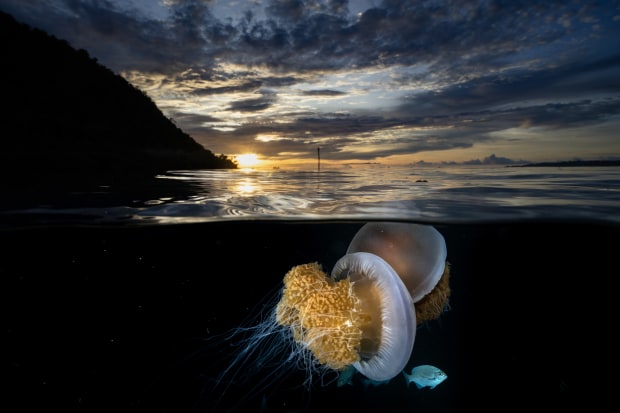 A Split shot at sunset, Raja Ampat. This shot was taken from a submerged step at a pier on Mansear Island, at a time where a huge wave of Jellyfish flooded through on the rising tide.