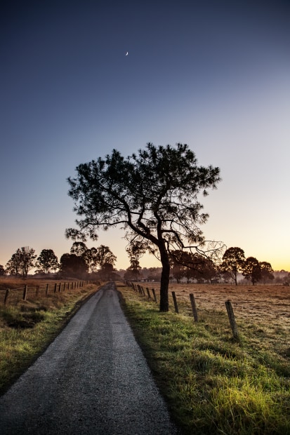 The image captures a moment of stillness, when the world feels untouched. The contrast between the cool blues of early sky and the emerging amber tones of sunrise reflects the transition between darkness and day. The lone tree, anchors the composition as both subject and guardian of the road.
