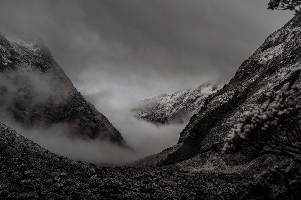 A moody winter veil settles over the Valley, a glacial corridor in Milford Sound where cloud, shadow and snow-dusted peaks fold into one another, creating a quiet, dramatic stillness.