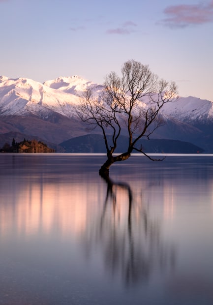 On a -1 deg morning the rising sun sets the snow capped mountains alight, with the Wanaka Tree standing proud in the lake.