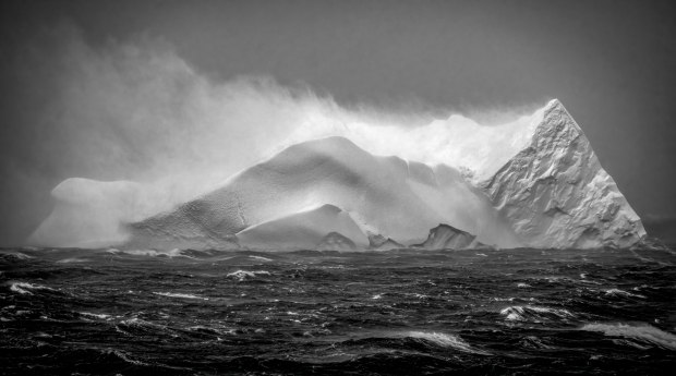 A furious wind whips up the snow off an iceberg in Antarctica and is highlight by the amazing light.