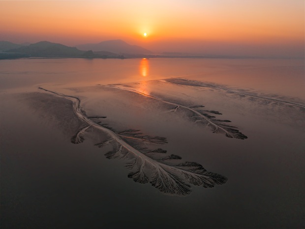 Photographed at sunrise along the Qiantang River in Zhejiang, China, this image show the branching forms left on the mudflats as the tide recedes. In the warm morning light, three tree-like tidal patterns unfold with rhythm and balance, resembling quiet calligraphy written by water and time.