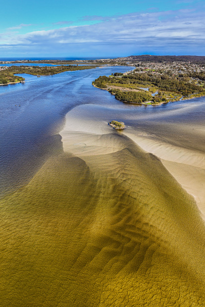 This areial image captures the meeting of tidal and sediment movment within a coastal estuary system. As currents shift & water levels recede, sand is sculpted into transient formations that only exist for a short moment in time before being reshaped by the next tide cycle. The photograph explores the quiet artistry of coastal change, where water, gravity, and time collaborate to create temporary natural sculptures. it invites the viewers to pause and consider the subtle beauty found in environments that are constantly, but slowly transforming.