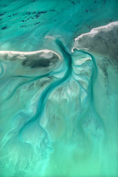 Tidal currents carve channels through pale sand flats, while prevailing winds comb the dunes into layered ridges and crescent forms. From above, these natural forces trace elegant contours along the coastline — rippling patterns in sand and water that reveal the ever-changing dialogue between ocean and land.