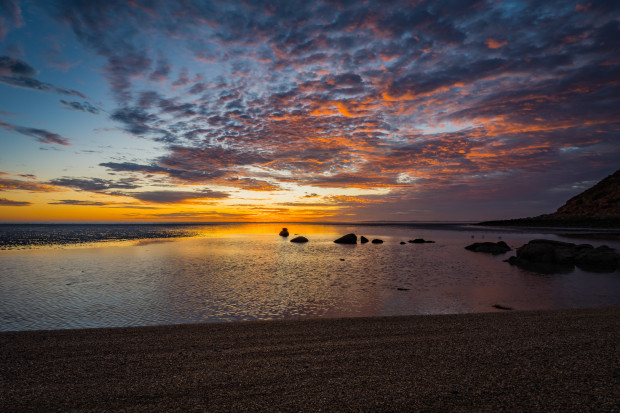 Early morning sunrise chasing. The tide is out exposing mudflat, normally submerged rocks and beach.