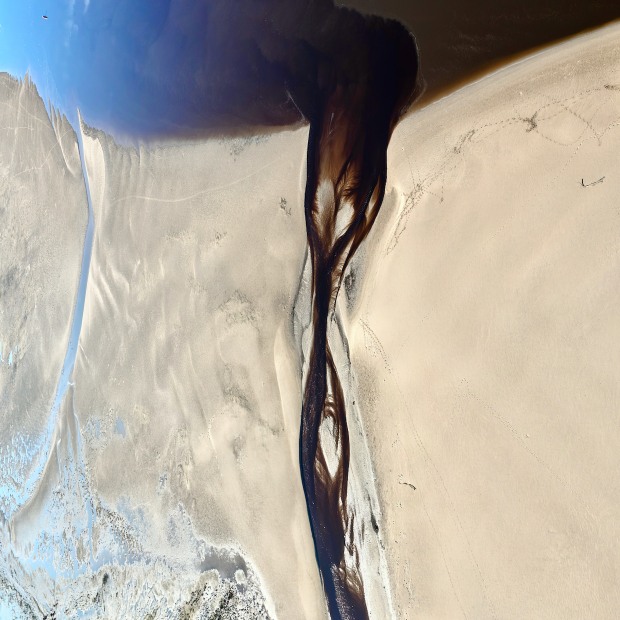 ‘Toluncan’ is the indigenous Boonwurrung name for Anderson Inlet, an area of everchanging tidal mudflats, fed from the east by the Tarwin River, exiting to Bass Strait in the west near Inverloch on the Victorian coast. It was here that the first dinosaur bones were discovered in Australia. Views from the sky often reveal otherwise unseen colours and patterns and from a viewpoint of only fifty metres above the surface, you can enter a world of almost dreamlike images. On an early morning in July 2022, the tide was out, revealing a series of mesmerising patterns of blue water, brown shallows and sand ripples, forming unique images which changed forever with the incoming tide. The Bunurong people have occupied this area for tens of thousands of years and I think about how the patterns they may have seen, even so long ago, were also unique.