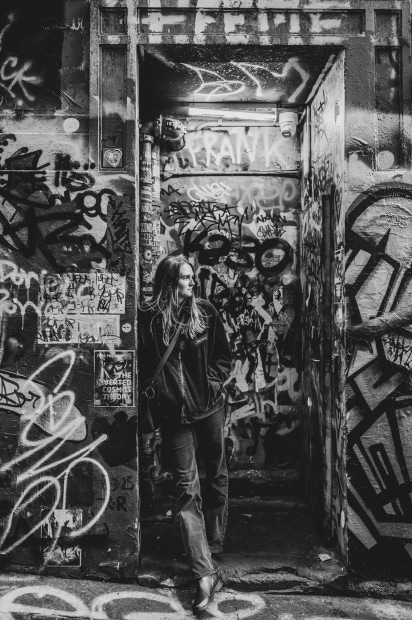 B&W image of lady waiting in the doorway of a highly graffitied building.