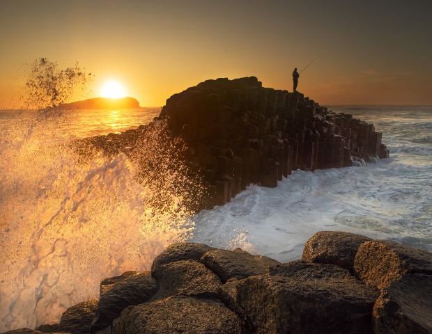 Sunrise swell at Fingal Head, with an intrepid fisherman trying his luck on the causeway.