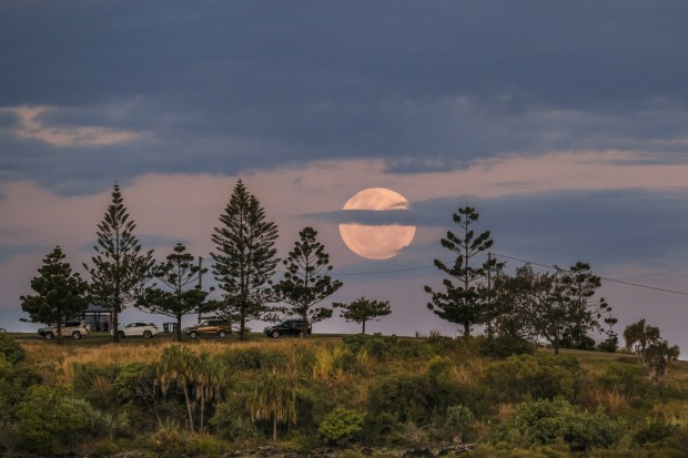 Cars gather at a vantage point to watch the Strawberry Moon rise