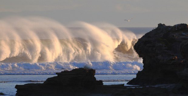 An offshore wind blows spray from the waves at Point Lonsdale in Victoria.