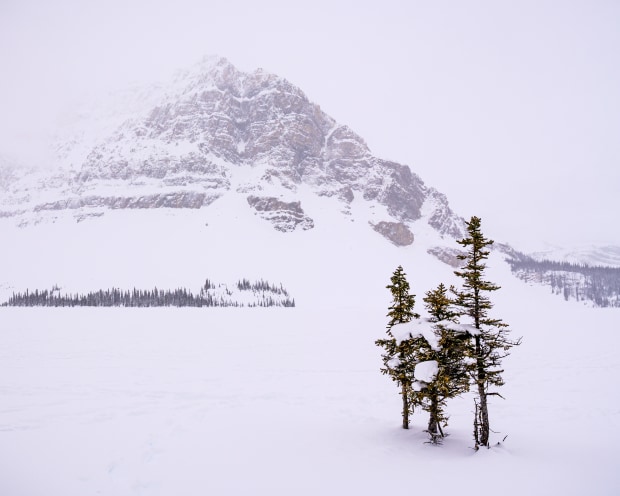 Bow Mountain in the Canadian Rockies towers in the background in a winter storm with three stunted trees surviving the harsh winter